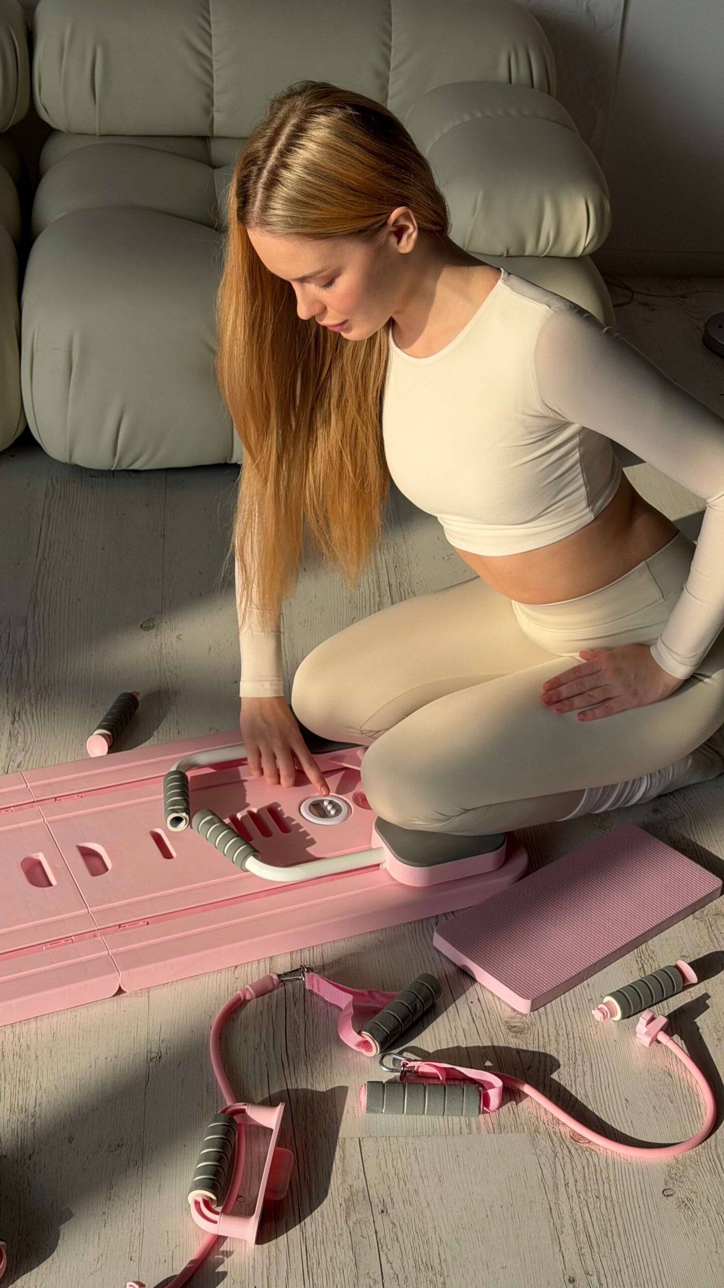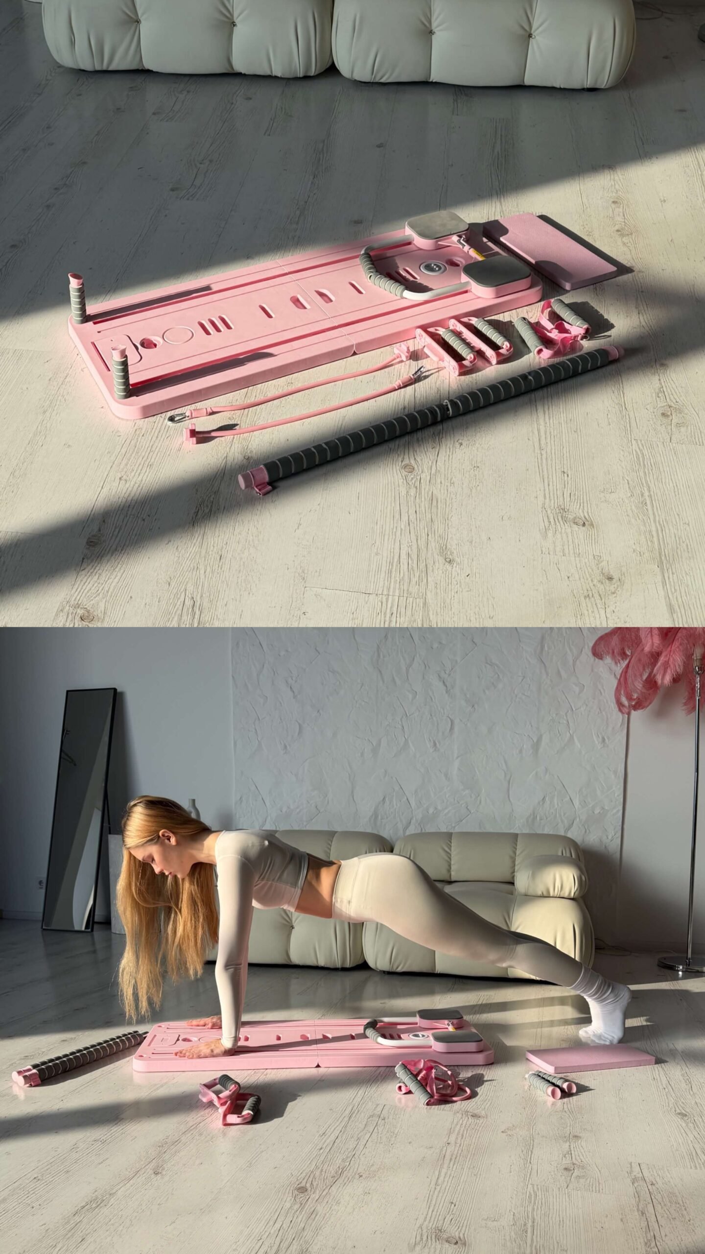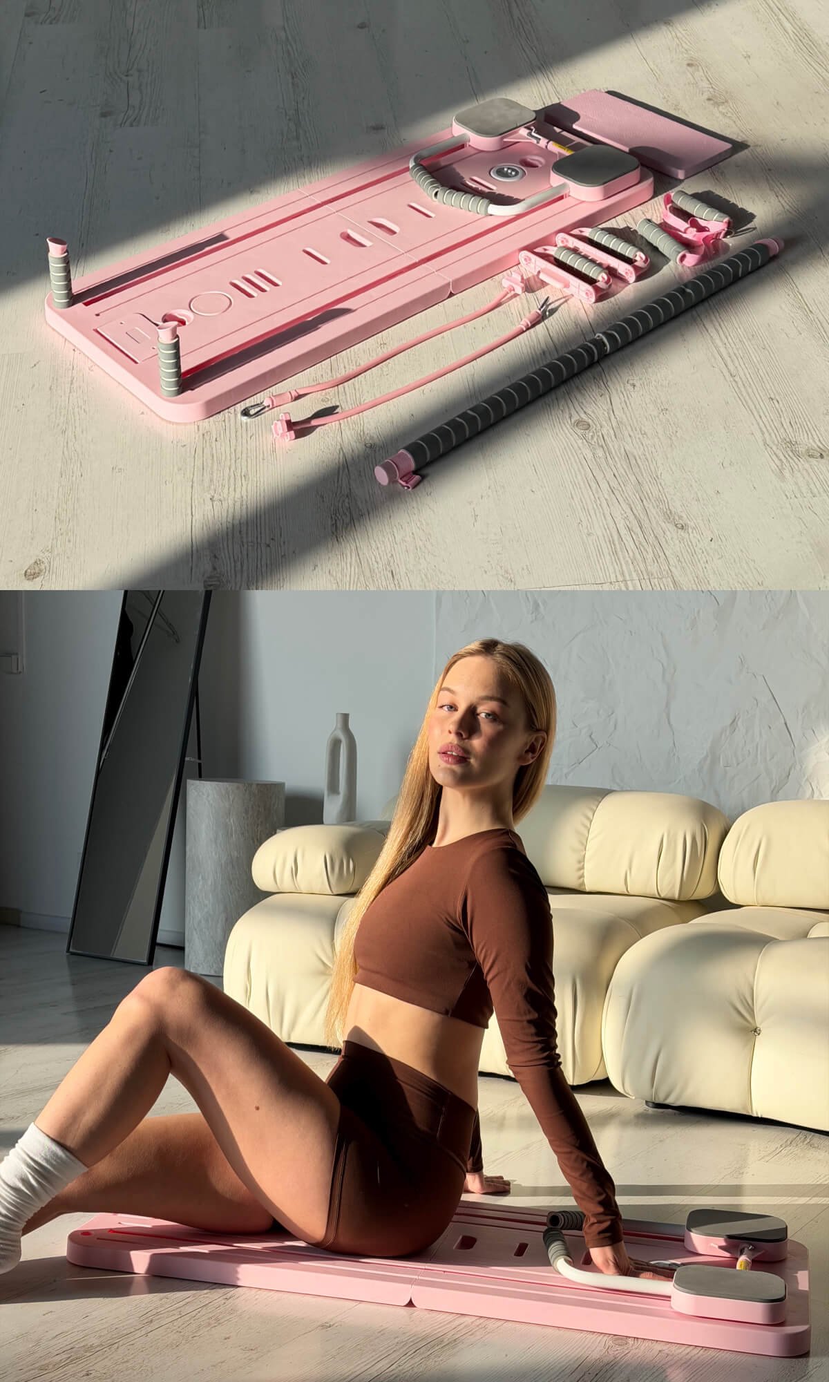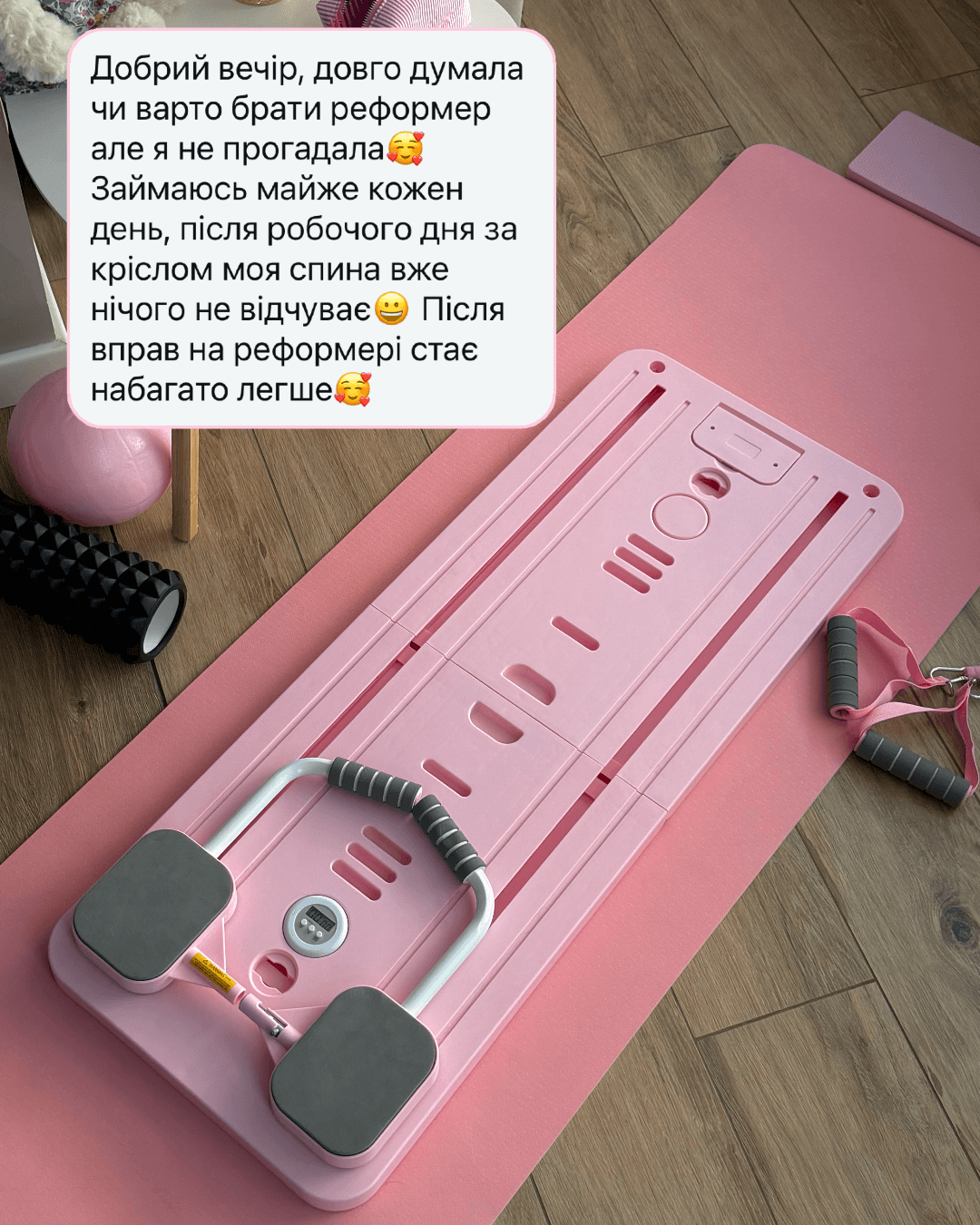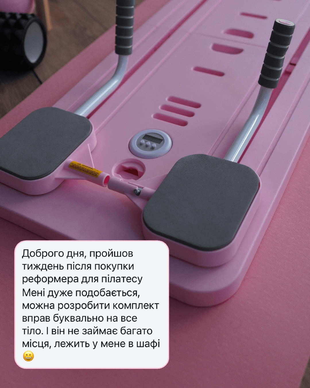 Продумана конструкція забезпечує комфорт під час занять і дозволяє виконувати широкий спектр вправ для всього тіла – від глибокого кору до ніг, спини та рук. Завдяки компактному формату реформер легко інтегрується в домашній інтер’єр і не потребує спеціального простору чи складного монтажу.